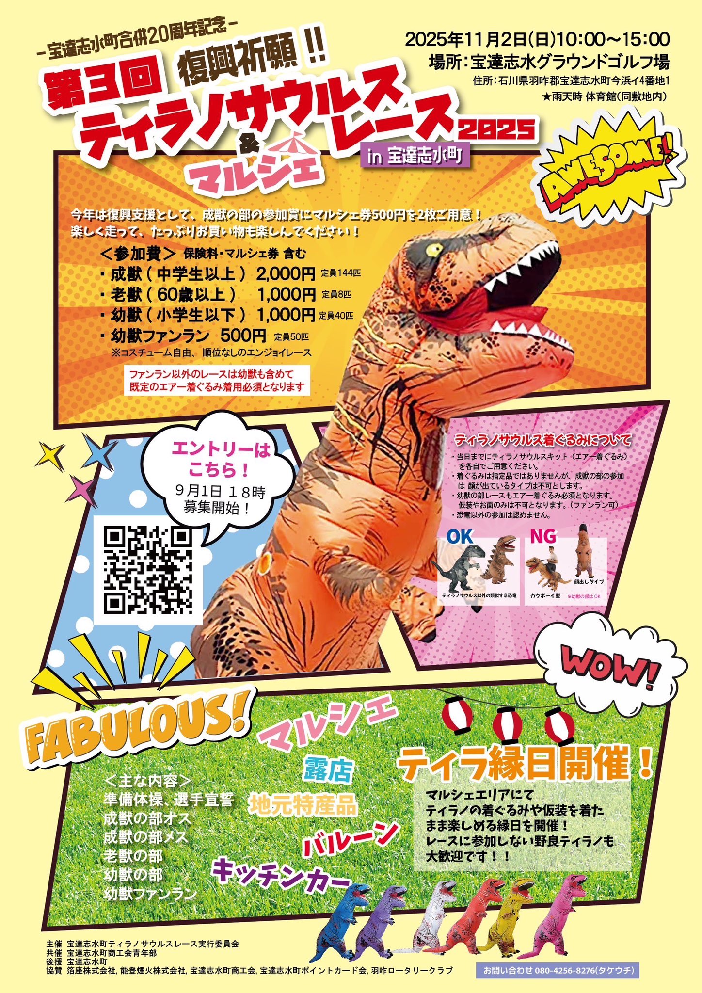 日々日常のいろいろ 第3回 復興祈願 ティラノサウルスレース2025 in 宝達志水 に参加!! 本日11/2は、タイトル通りティラノサウルスレースに参加してきました。 2025.11.02 日々日常のいろいろ