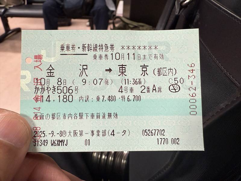 会社を7時過ぎに出て免田駅へ、金沢で新幹線かがやき506号で東京へ。