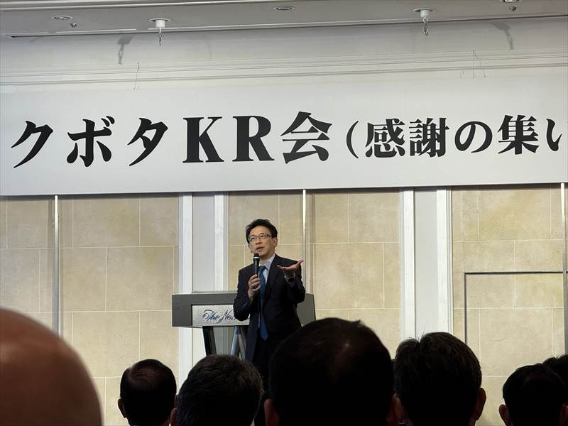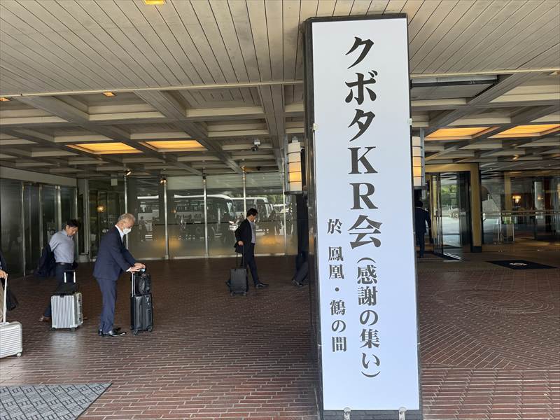 式典受付が14時、始まるまでの間別室にてウエルカムドリンクを、14時30分から式典が始まり、クボタの売り上げ等の話や建機のモデルチェンジの話がありました。